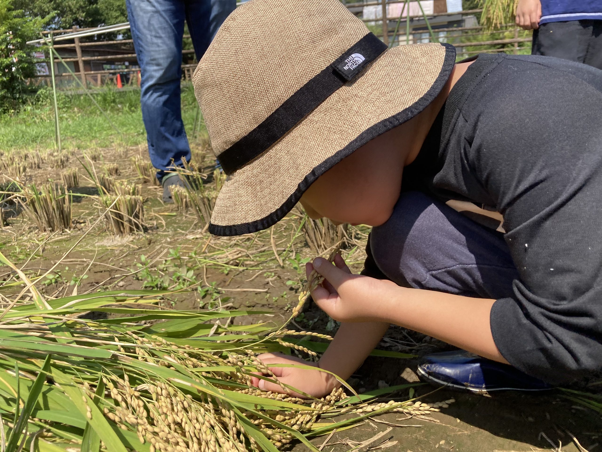 春に自分たちで植えたものが立派に育っているのを見て驚く子どもたち。お家の人と一緒に稲を刈る作業も頑張りました。「この一粒一粒にお米が入っているんだよ。」と教えてもらうと真剣な表情で見つめ、匂いをかいでいました!