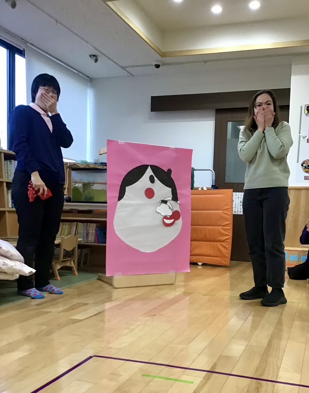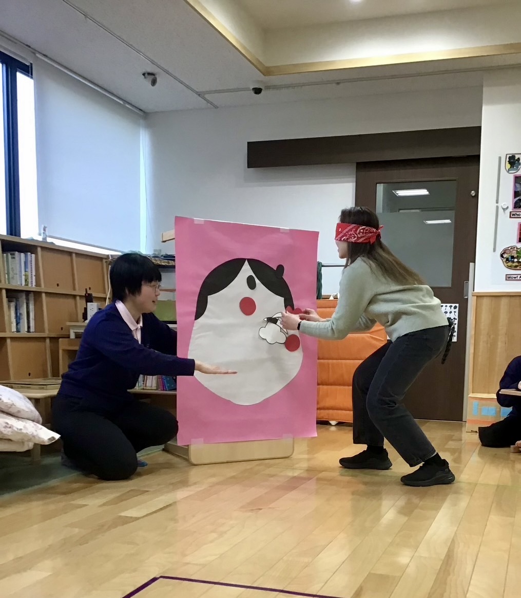1月のお誕生日会は英語講師が福笑いに挑戦!