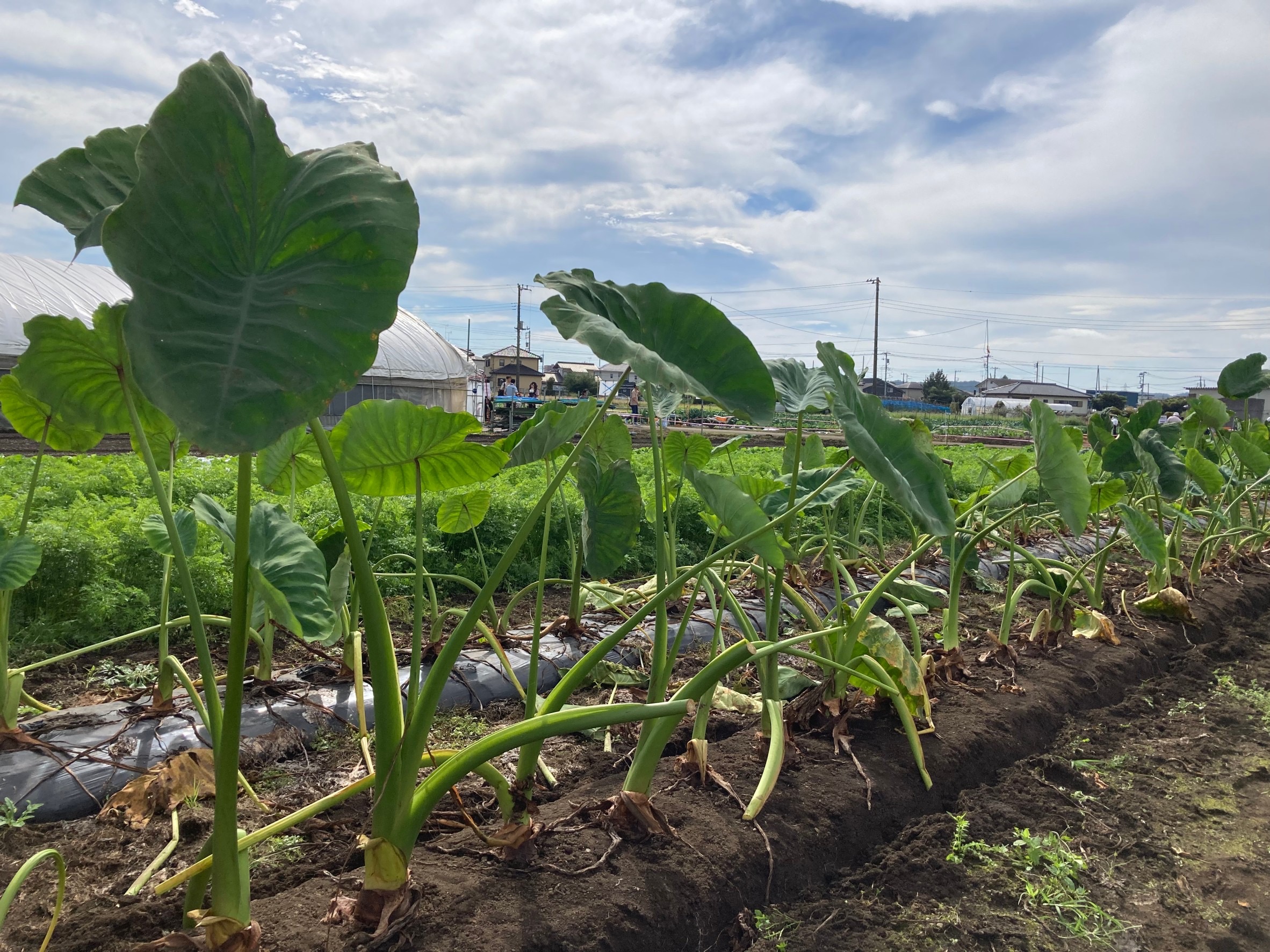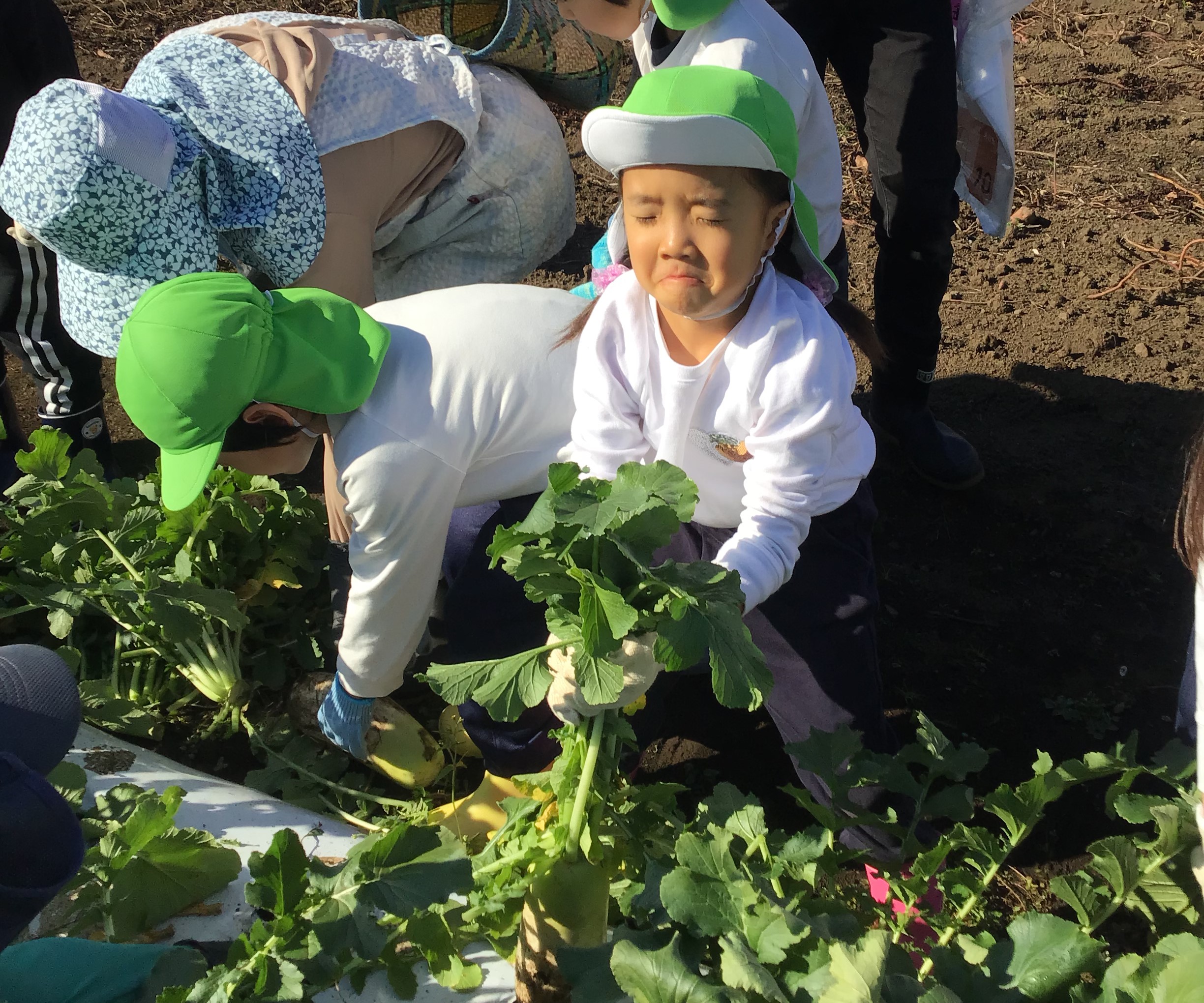 畑には大きな葉っぱの里芋もあり、お父さんお母さんたちと一緒に力を合わせて掘っています!