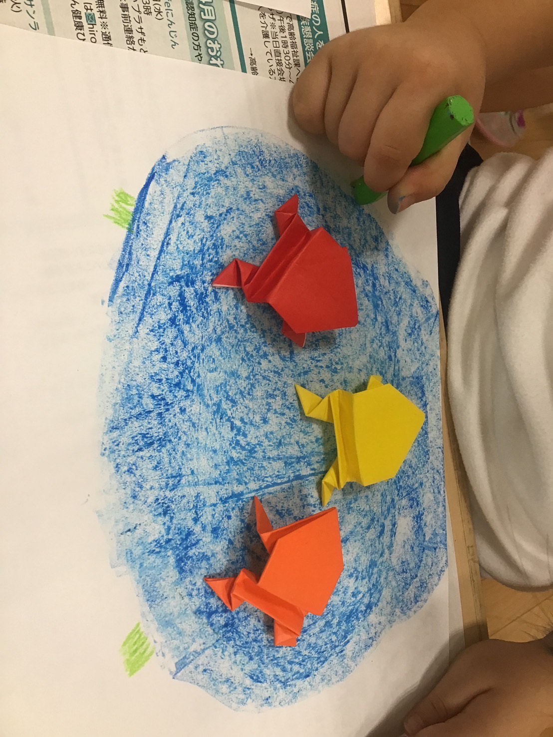 クレヨンの持ち手部分で色を塗ると普通に描くものと色の付き方が違うと知り、池の水は持ち手部分で。草は普通に。と描きわけながら素敵な作品を作っていました!