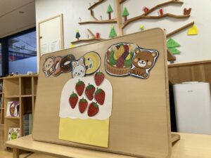 今月のお誕生会は、お誕生月のお友だちが大きなケーキのトッピングのお手伝いをしてくれました☆