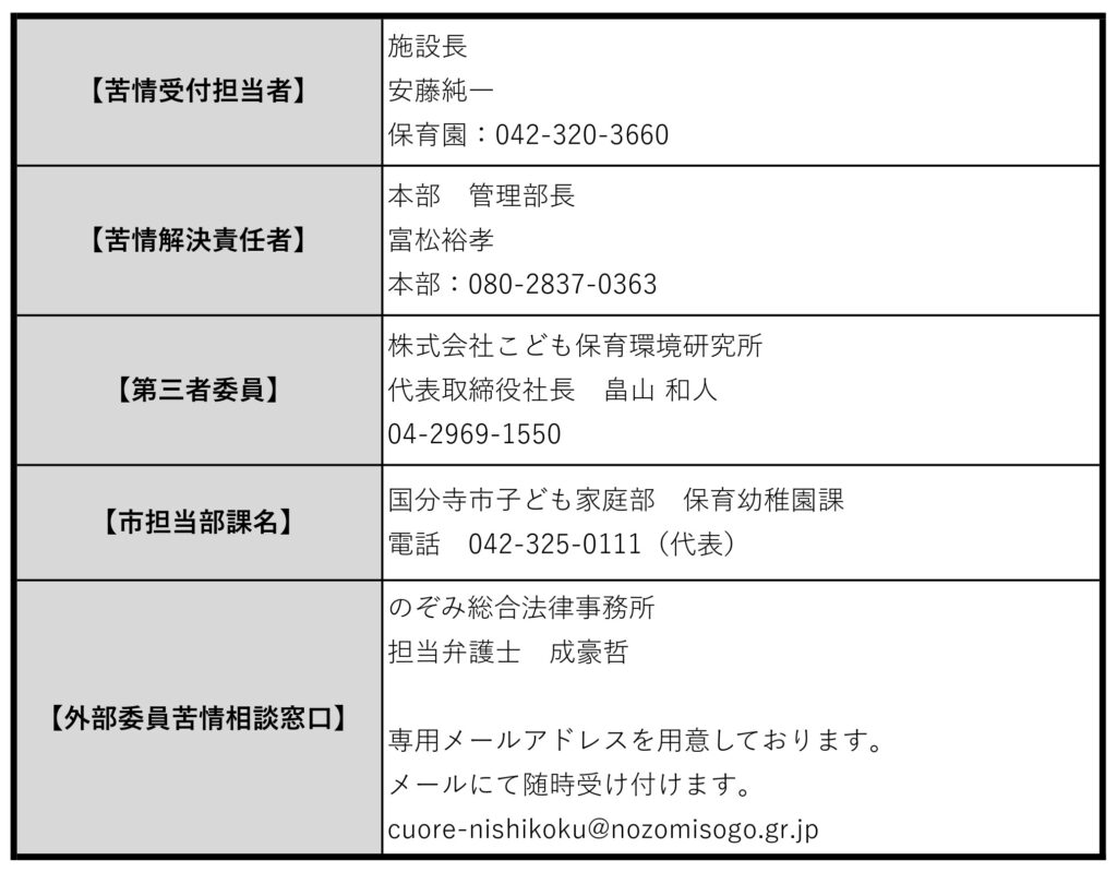 苦情は面接、電話、書面、メールなどにより随時受け付けます。